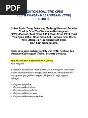 Fakta menunjukkan bahwa terdapat banyak peserta yang gagal dalam tes penerimaan calon pegawai negeri sipil (cpns). Pusat belajar soal cpns no.1 indonesia. Pada saat menjelang perayaan hut republik indonesia sering diadakan pawai dan 23. Mana yang mungkin terjadi ? Kumpulan contoh soal tes twk cpns tahun ini. Kementerian pendayagunaan aparatur negara dan reformasi birokrasi menyebutkan pelaksanaan computer assisted test (cat) bagi calon pegawai negeri sipil atau cpns akan menyediakan soal yang komprehensif. Kumpulan soal twk cpns yang telah lalu (14 ebook). Jumlah soal cat cpns online ini sebanyak 100 soal dengan katagori: Para peserta tes cpns diminta untuk mengerjakan soal berjumlah 100 dalam waktu 90 menit. Kunci jawaban e setelah jepang mengalami kekalahan di berbagai kawasan, muncul perbedaan. Tes ini tentunya akan menjadi kelompok soal yang pertama kali di uji oleh pelamar cpns tahun ini. Contoh soal tiu cpns tes logika umum. Contoh twk tes wawasan kebangsaan soal cpns yang sering muncul saat tes nanti jgn lupa subscribe untuk melihat soal soal.
