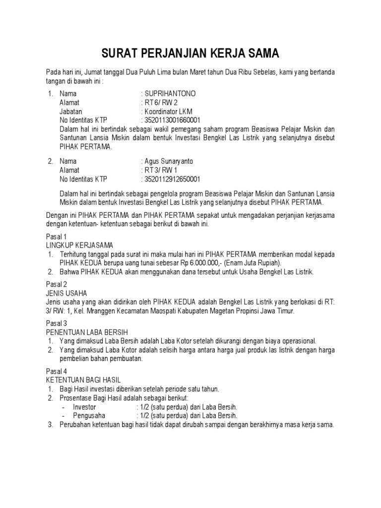 Berikut adalah contoh surat perjanjian kerjasama bagi hasil proyeke bisnis antara dua pihak yang bersepakat untuk mendirikan sebuah restoran di daerah menerangkan bahwa pihak pertama merupakan perseorangan yang memiliki maksud untuk melakukan investasi kepada pihak kedua. Contoh surat perjanjian kerjasama bagi hasil bisnis. Melalui kontrak terciptalah perikatan atau hubungan hukum yang menimbulkan. Siapa saja pastinya selalu melakukan kerjasama untuk semakin memperluas link ataupun sebagai bentuk kerjasama dalam hal pekerjaan. Surat perjanjian kerjasama investasi pada hari ini tanggal tujuh bulan juni tahun dua ribu dua belas 07062017 yang bertanda tangan di bawah ini. Surat perjanjian memiliki sifat mengikat semua pihak yang terlibat di dalamnya. Memberikan investasi modal kepada pihak lain. Melihat dari manfaat dan isi surat perjanjian kerja sama usaha di atas, kita tentu sudah dapat menggambarkan poin apa saja yang harus dimasukkan dalam surat perjanjian kerjsa sama usaha. Bahwa pihak pertama adalah 3. Jika anda merasa cocok dengan tawaran kerjasama 3. Anda bisa menemukan contoh surat perjanjian kerjasama beserta strukturnya dengan mudah di internet. Contoh mou dibawah ini merupakan perjanjian antar pihak yang menyediakan pendanaan (pihak pertama) dengan pihak yang mengelola keuangan dengan sistem bagi hasil (pihak kedua). Sleman, 17 agustus 1977 alamat :